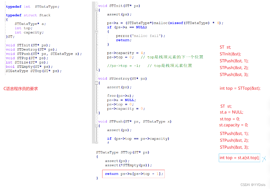 - 当delete栈Stack时,先调用析构函数(free掉刚刚_array指向的新空间),再free掉Stack所处的空间;
