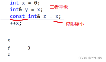 - 权限低的不能给另一量取别名/取地址(权限的放大)