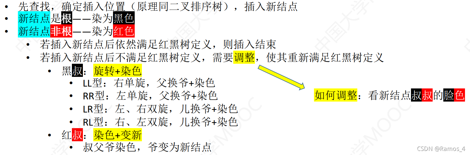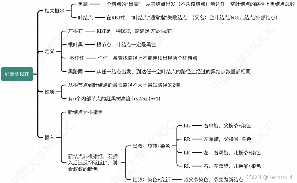 ⑤对每个结点,从该节点到任一叶结点的简单路径上,所含黑结点的数目相同简记:左根右,根叶黑,不红红,黑路同