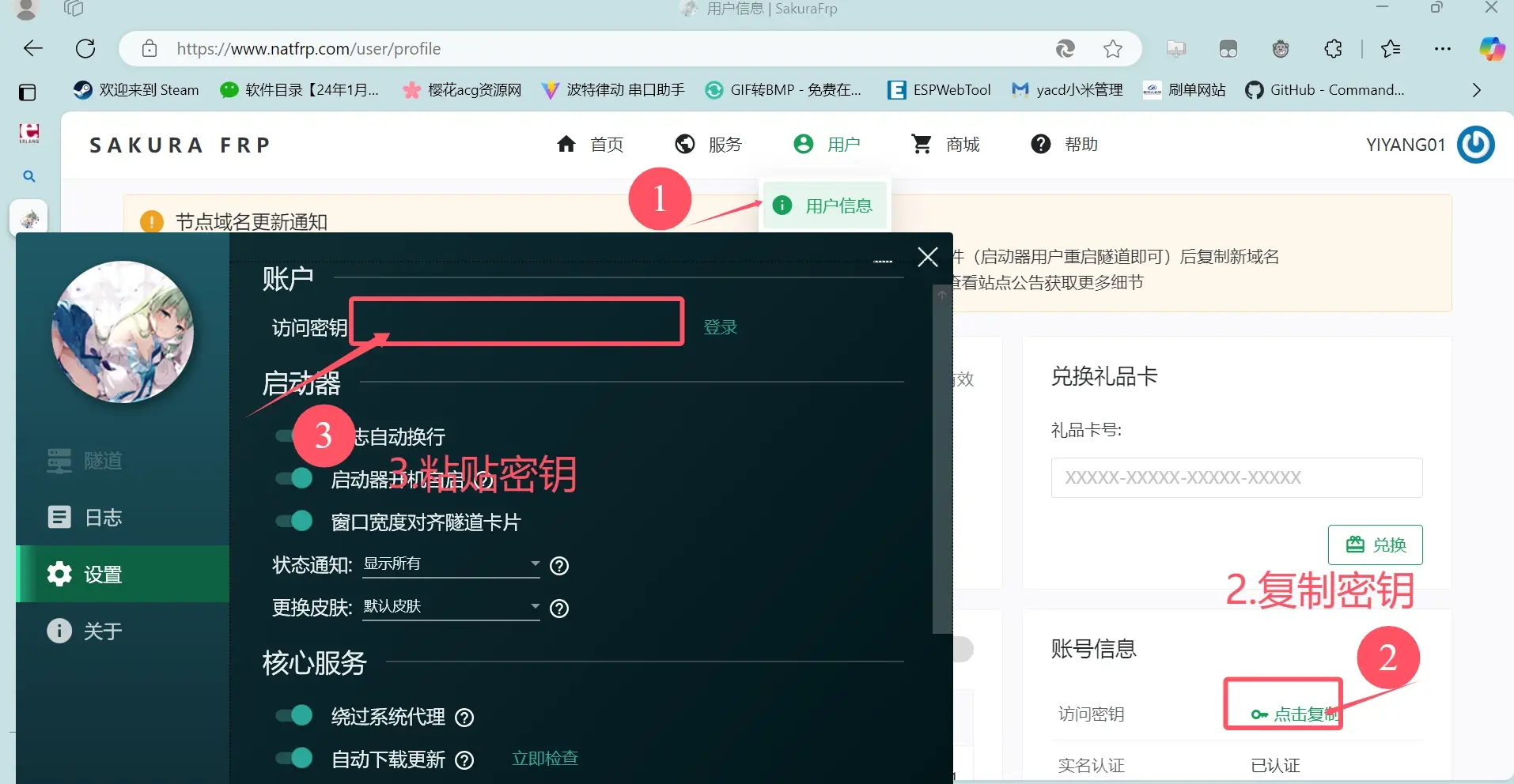安装完成后打开樱花启动器,在网站上的用户信息里复制密钥后粘贴登录