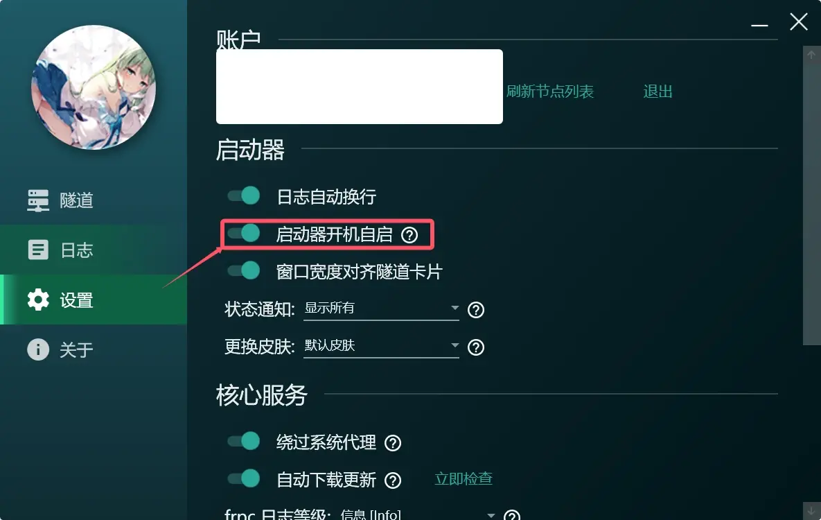 打开樱花frp启动器中的开机自启动