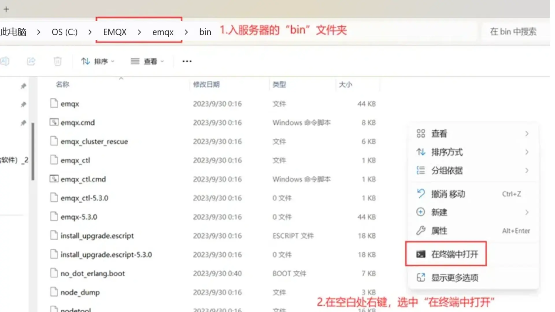 打开解压后的文件C:\EMQX\emqx\bin ,然后在空白界面单击鼠标右键盘,选择在终端中打开。输入命令./emqx start