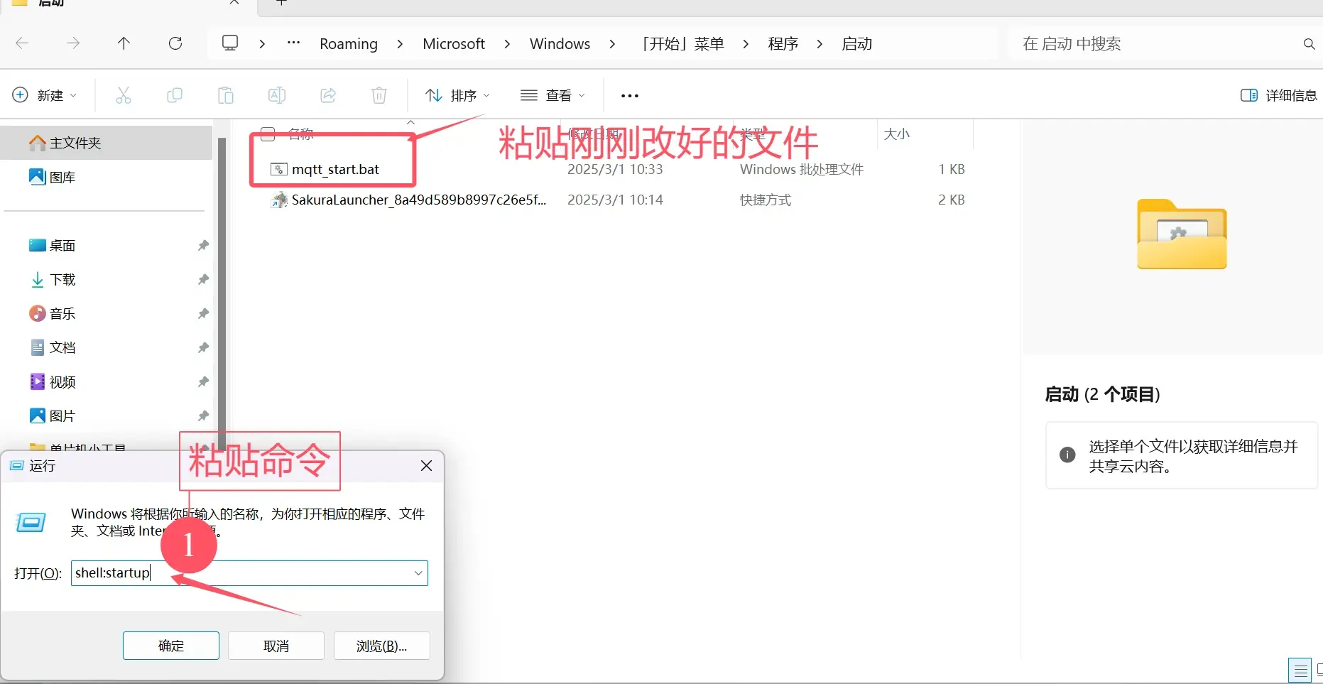 🔹按下 Win + R,输入 shell:startup→ 拖入bat文件至文件夹。