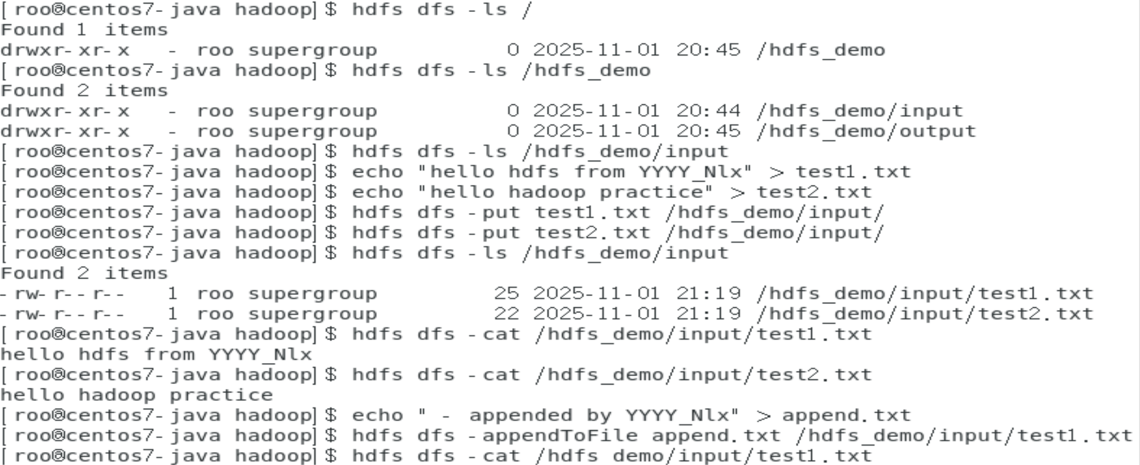 hdfs dfs -appendToFile append.txt /hdfs_demo/input/test1.txt