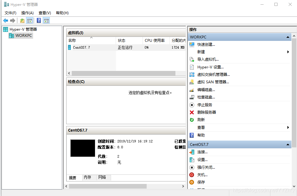 打开Hyper-v管理器,左侧会自动连接本机服务器,点击本机服务器,右侧会显示快捷菜单。
