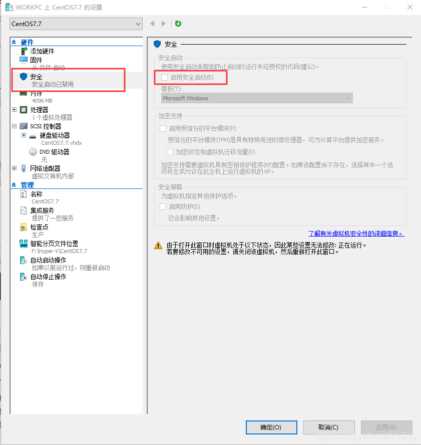 在此界面取消启用安全启动前的复先框。(我这里显示灰色是因为我的虚拟机已经启动,在虚拟机关机的情况下,这个是可以选择的)