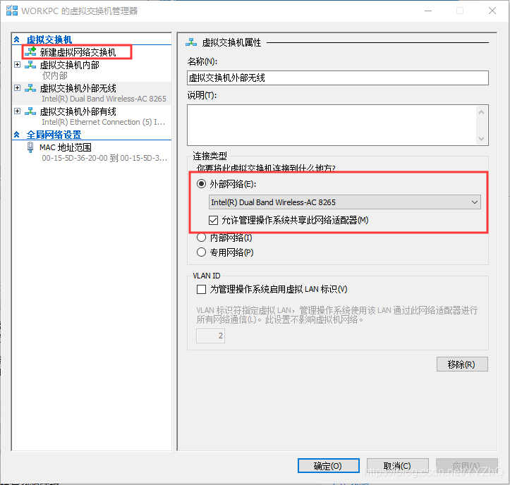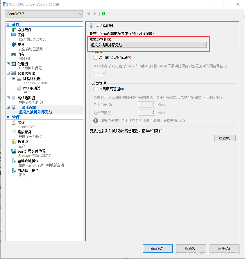 在这里我曾经遇到一个问题,就是点击应用时出错,添加不上虚拟网络交换机,且是非常严重的错误,具体什么错误当时没截图,现在也不想重试了,这个错误一度导致我的Hyper-V里的服务器停止服务了,后来重启电脑才好。而当时为什么添加不上,却是因为之前虚拟机一直上不了网的时候,有一篇文章说在网络适配器上设置共享,也不知道是我没看清楚还是文章有错误,总之我就在我正在使用的无线网络设备上右键属性共享添加了共享,然后再在这个界面添加虚拟网络交换机的时候,选择这个设备就无论如何都添加不上去了,后来我取消了无线网络设备上的共享,然后就可以添加了。按照我本文之前的操作,你应该是没做过共享的,所以这一个问题应该不会碰到。