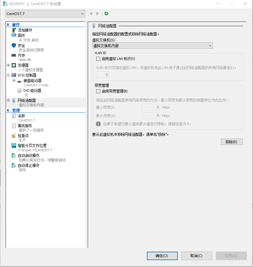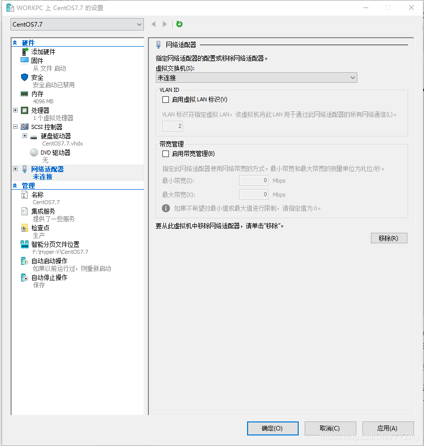 这时候这个界面左边也就是你的虚拟机硬件里会有两个网络适配器,点击原来的网络适配器(也就是原来不能上网的系统自带的Default交换机对应的网络适配器),界面与上面图类似,点击移除,点击应用,从虚拟机中删除掉之前不能上网的网络适配器。先移除还是先添加,这个不分前后,我这里先写添加再写移除,纯粹是为了少截一张图。之所以要移除之前的网络适配器,是因为前面我们提到的在CentOS系统里编辑的文件/etc/sysconfig/network-scripts/ifcfg-eth0,针对的是这里的最上面的网络适配器,如果不移除之前的,那从先后顺序上来讲,这个文件还是针对之前的网络适配器进行设置,当然你也可以复制一份ifcfg-eth1进行配置,有人提供过这个方案的,但是我没有采用,所以再此不做讨论。