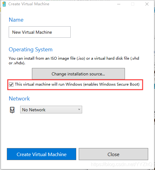 在此界面,修改Name属性(虚拟机显示的名称),点击Change installation source...选择下载的系统iso文件,因为我们虚拟机安装的不是windows系统,所以去掉This virtual machine will run Windows选项,Network选项中有一个默认的Default 虚拟交换机,因为在我后续配置网络的过程中给删除掉了,所以无法显示了,在此可以选择默认的虚拟交换机。具网上查说此默认的虚拟交换机可自动识别网络,也就是只要宿主机能上网虚拟机就能上网,很不幸,在我的虚拟机安装完成后,初始就是上不了网,在各种设置尝试时,我删除了这个默认的虚拟交换机,现在也弄不出来了。关于网络问题我后续会交待。在此说明的是,即使你选择了默认的交换机,最终虚拟机也上不了网,不要着急,后续会写明我最终上网的几种方式。