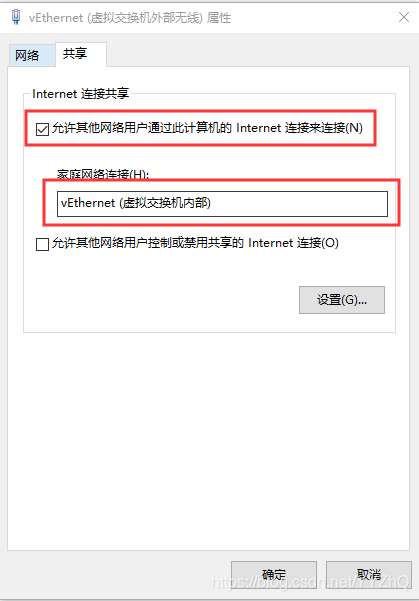 勾选允许其他网络用户通过此计算机的Internet连接来连接(N),在家庭网络连接中,选择刚刚创建的内部网络vEthernet,点击确定,会弹出提示框,提示共享的网络连接会设置IP为192.168.137.1,不用理会,点击确定。
