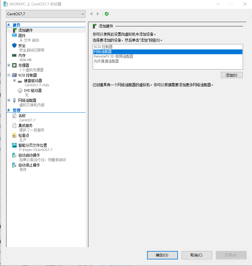 关闭虚拟机,点击设置,添加硬件--网络适配器,选择之前能上网的外部网络的虚拟交换机,此时虚拟机里有两个网络适配器。应用确定,重启虚拟机。