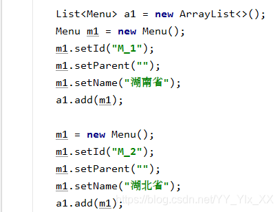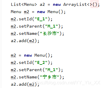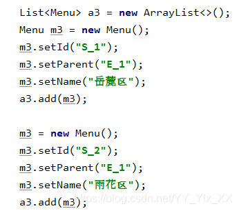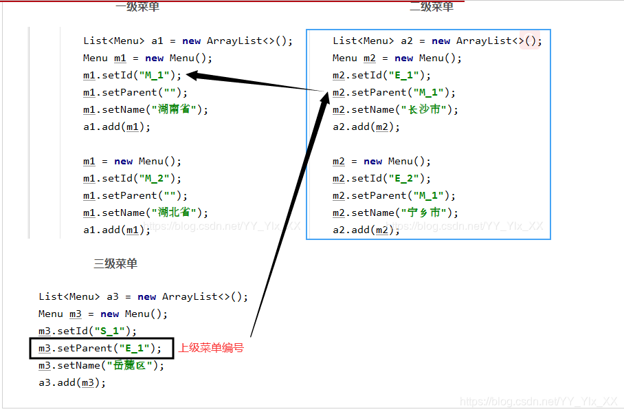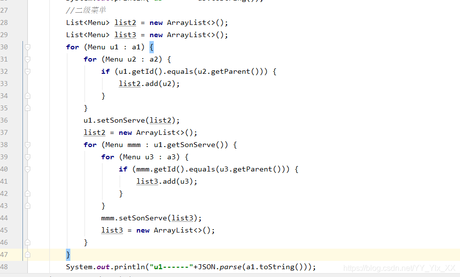 3.首先循环一级菜单在循环二级菜单,判断二级菜单的上级parentId是不是一级菜单的id,如果是的说明就是二级菜单,就要创建一个集合,把所有的二级菜单存到这个集合中去,然后三级菜单也是将二级菜单List循环,然后放到三级集合去.....四级就是循环三级list,往后都是这样,完整代码如下: