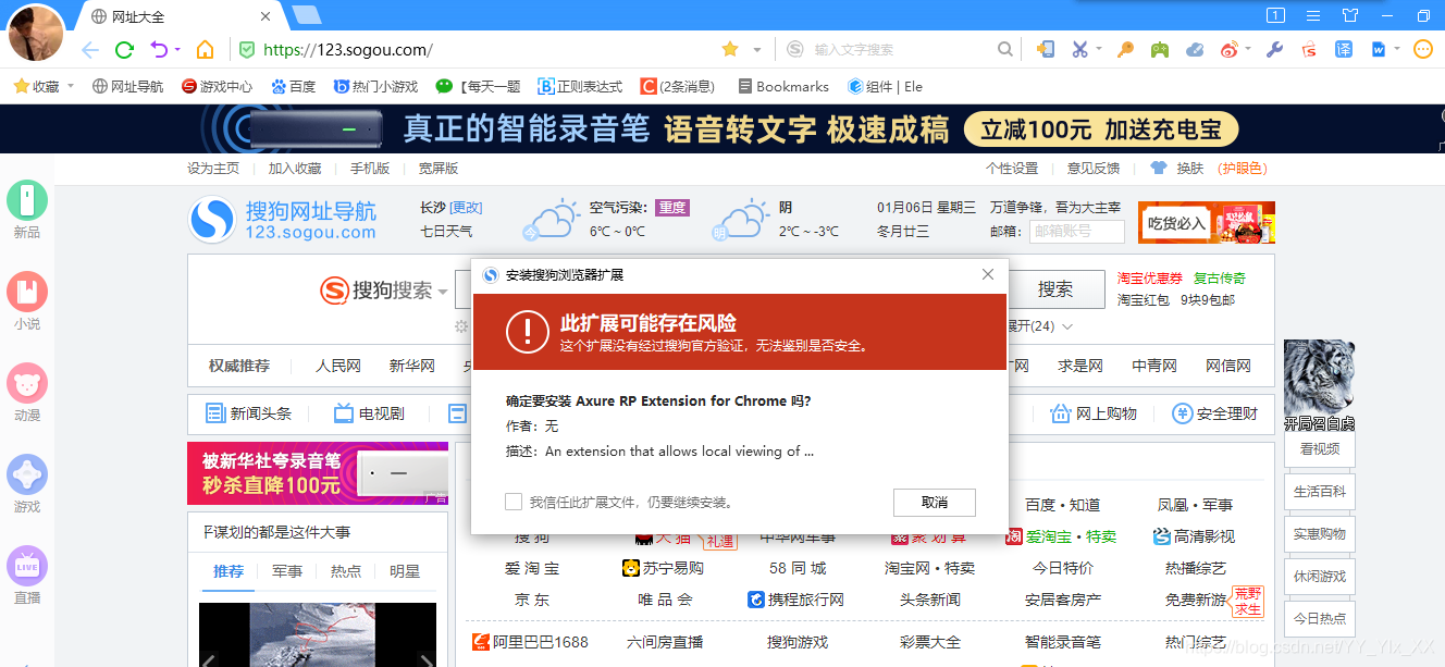 1.当我们用网页访问一个本地页面时就会出现这种问题,提示你要安装浏览器的扩展程序包,以下有搜狗浏览器如何安装,qq浏览器