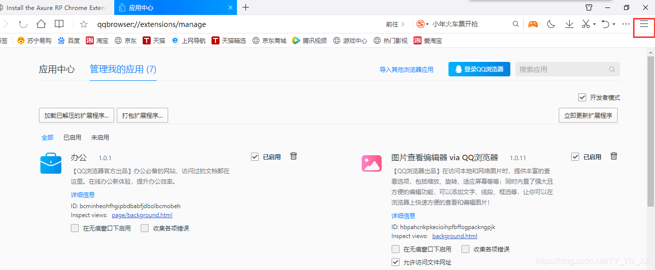 1.2.2 点击右上角的红框内容打开应用中心------》 点击管理我的应用 -------》 然后将刚刚得到的扩展程序包拖进来