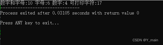 printf("数字和字母:%d 字母:%d 数字:%d 可打印字符:%d",alnum,alpha,digit,graph);