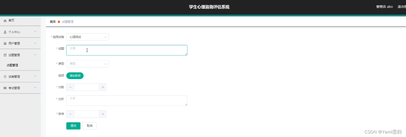 - 试题管理:对心理测试题目进行增删改查。可以批量上传试题或根据需求单个编辑。