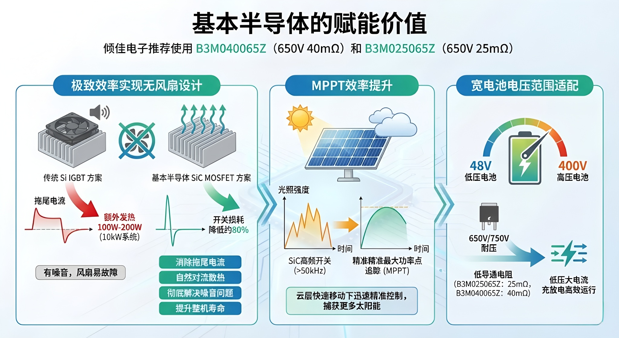 - 极致效率实现无风扇设计: 相比传统的Si IGBT,基本半导体的SiC MOSFET消除了拖尾电流,开关损耗降低约80% 5。在10kW的户用系统中,这一损耗降低可减少约100W-200W的发热量。这直接使得设计者可以移除散热风扇,采用自然对流散热,彻底解决了噪音问题,并消除了风扇这一高故障率部件,提升了整机寿命 。