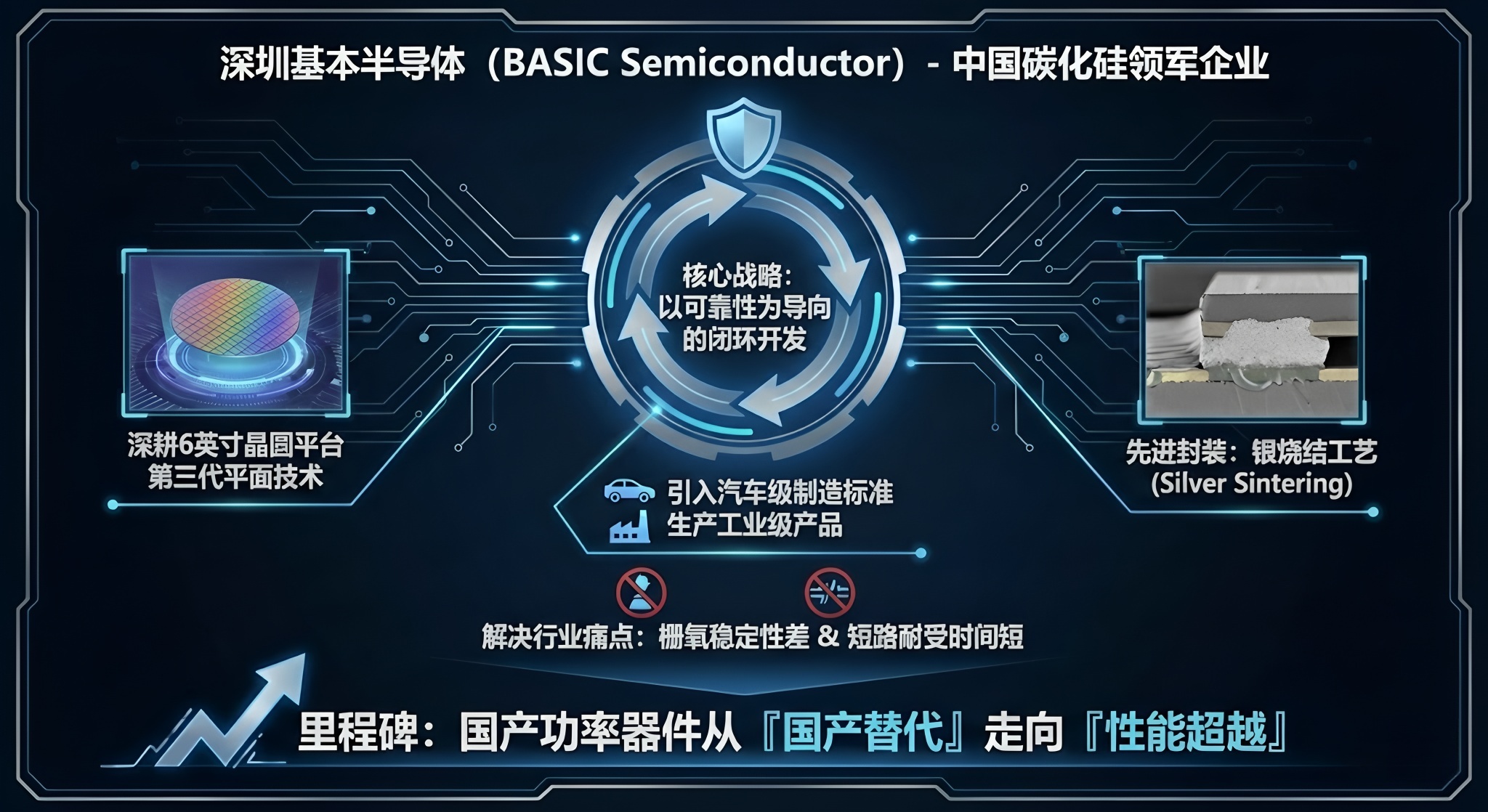 深圳基本半导体股份有限公司(BASIC Semiconductor,以下简称“基本半导体”)作为中国碳化硅功率器件领域的领军企业,展现了与传统IDM厂商不同的技术哲学。其核心战略在于“以可靠性为导向的闭环开发” 。不同于早期SiC市场单纯追求缩小芯片面积以降低成本的激进策略,基本半导体选择了在6英寸晶圆平台上深耕第三代平面技术,通过引进汽车级制造标准来生产工业级产品,从而系统性地解决了SiC MOSFET早期存在的栅氧稳定性差、短路耐受时间短等行业痛点 。