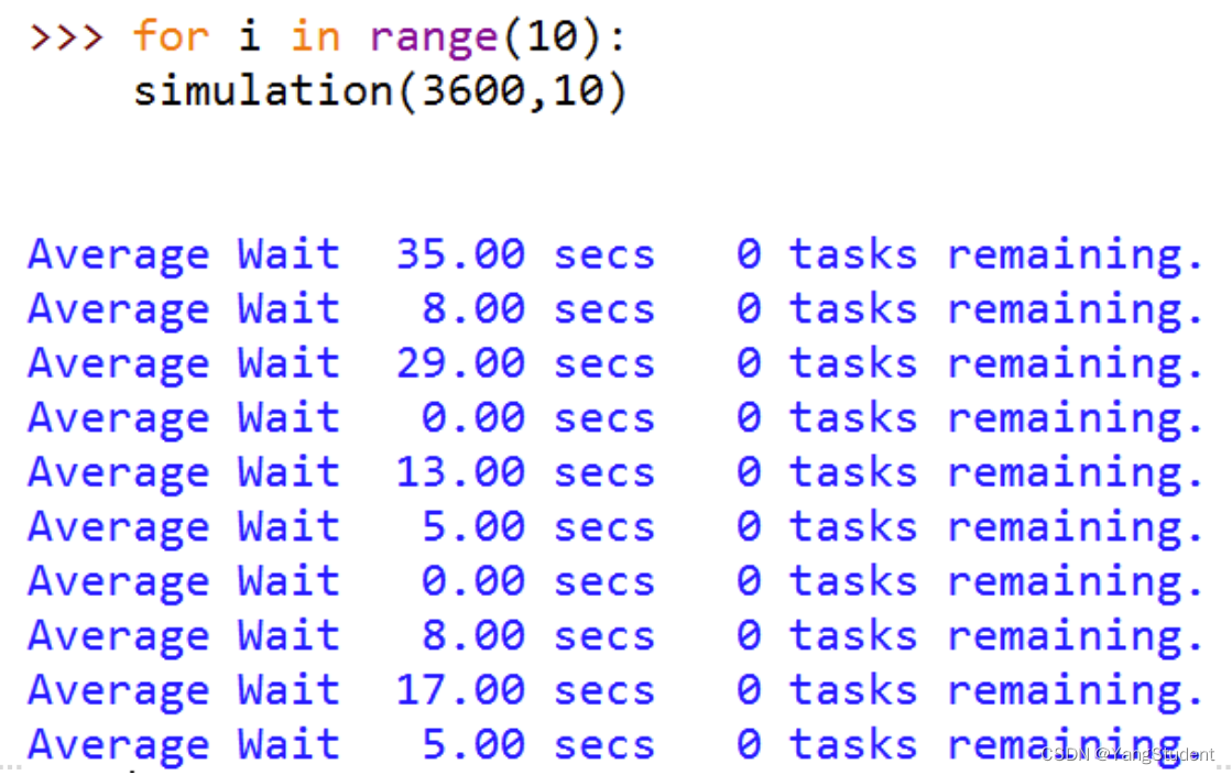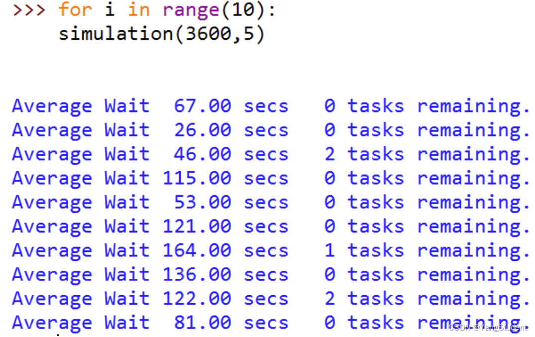 print("Average wait %6.2f secs %3d tasks remaining." %(average_wait, len(print_queue)))