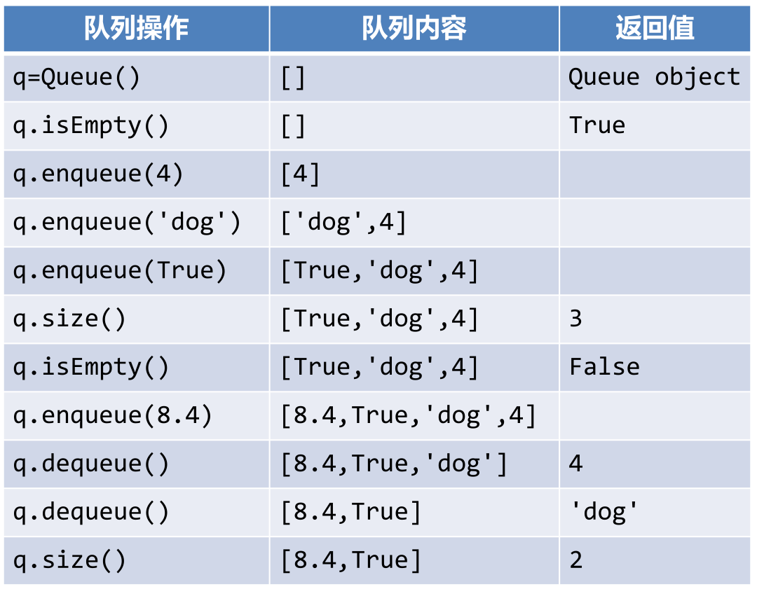 - enqueue(item):将数据项item添加到队尾,无返回值;即入队。