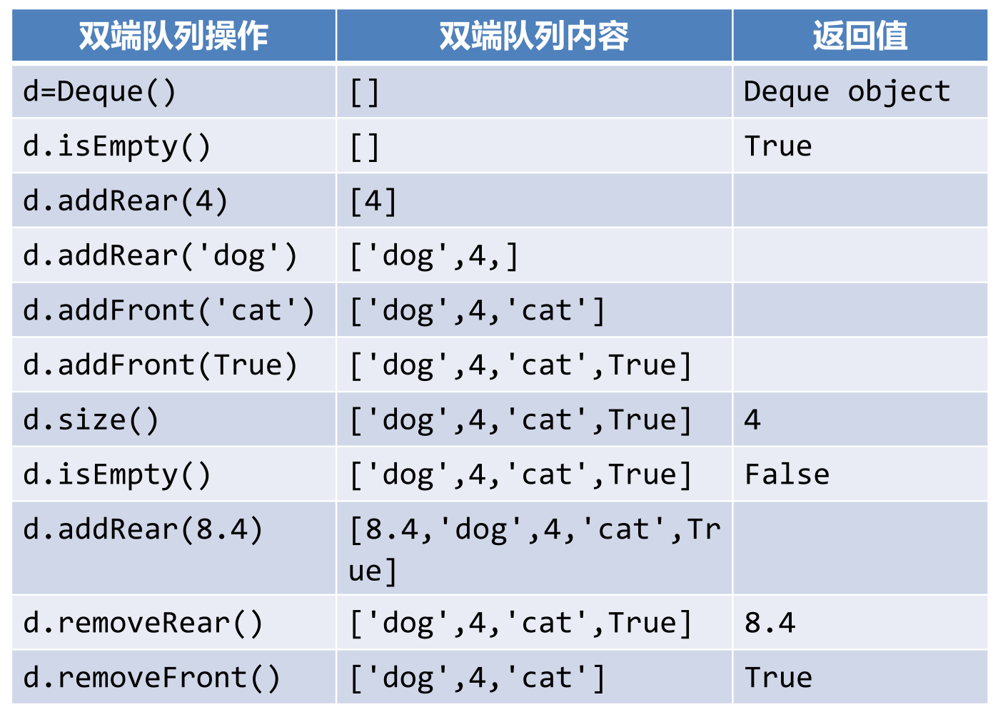 - Deque():创建一个空双端队列