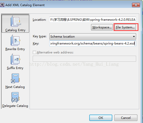 3.Location -> FileSystem中选择spring根目录 -> schema -> beans,选择与项目依赖的版本对应的文件:
