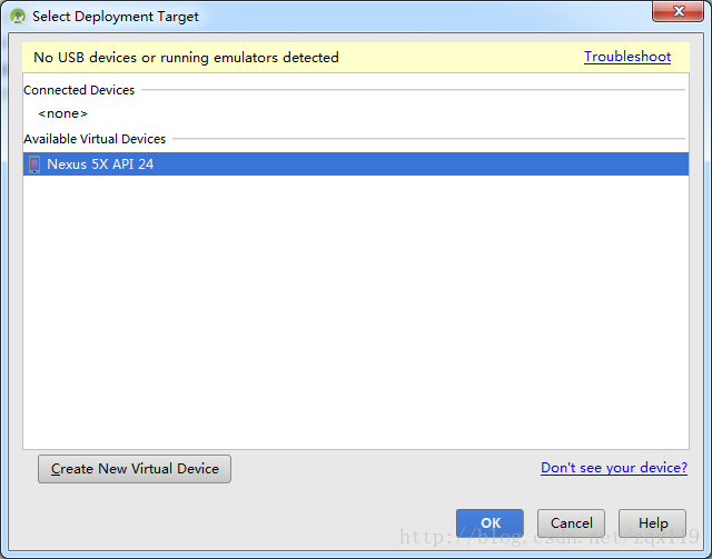 (下图 的 Nexus 5X API 22 就是我们创建的虚拟机)点击ok