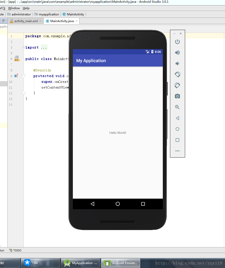 然后再模拟机中就可以看到默认的HelloWorld了