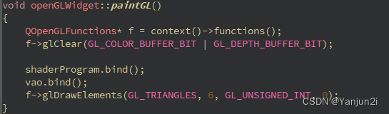 f->glDrawElements(GL_TRIANGLES, 6, GL_UNSIGNED_INT, 0);:这行代码使用 glDrawElements 函数来绘制三角形。GL_TRIANGLES 指定了要绘制的图元类型为三角形。6 表示绘制要取顶点数(前面设置了索引3个点一组,输入的必须是3的倍数)。GL_UNSIGNED_INT 指定了索引数据的类型为无符号整数。0 有待确认