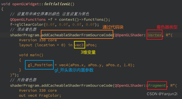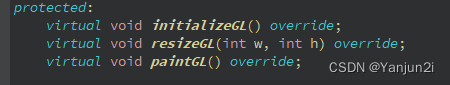 所以在重写虚函数的时候,在initializeGL函数中写着色器。