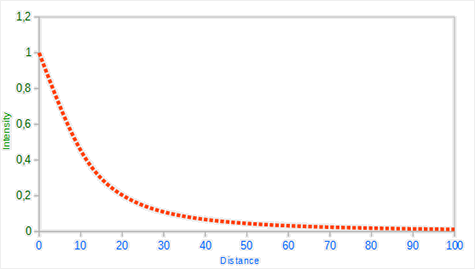 可以看到光在近距离的时候有着最高的强度,但随着距离增长,它的强度明显减弱,并缓慢地在距离大约100的时候强度接近0。