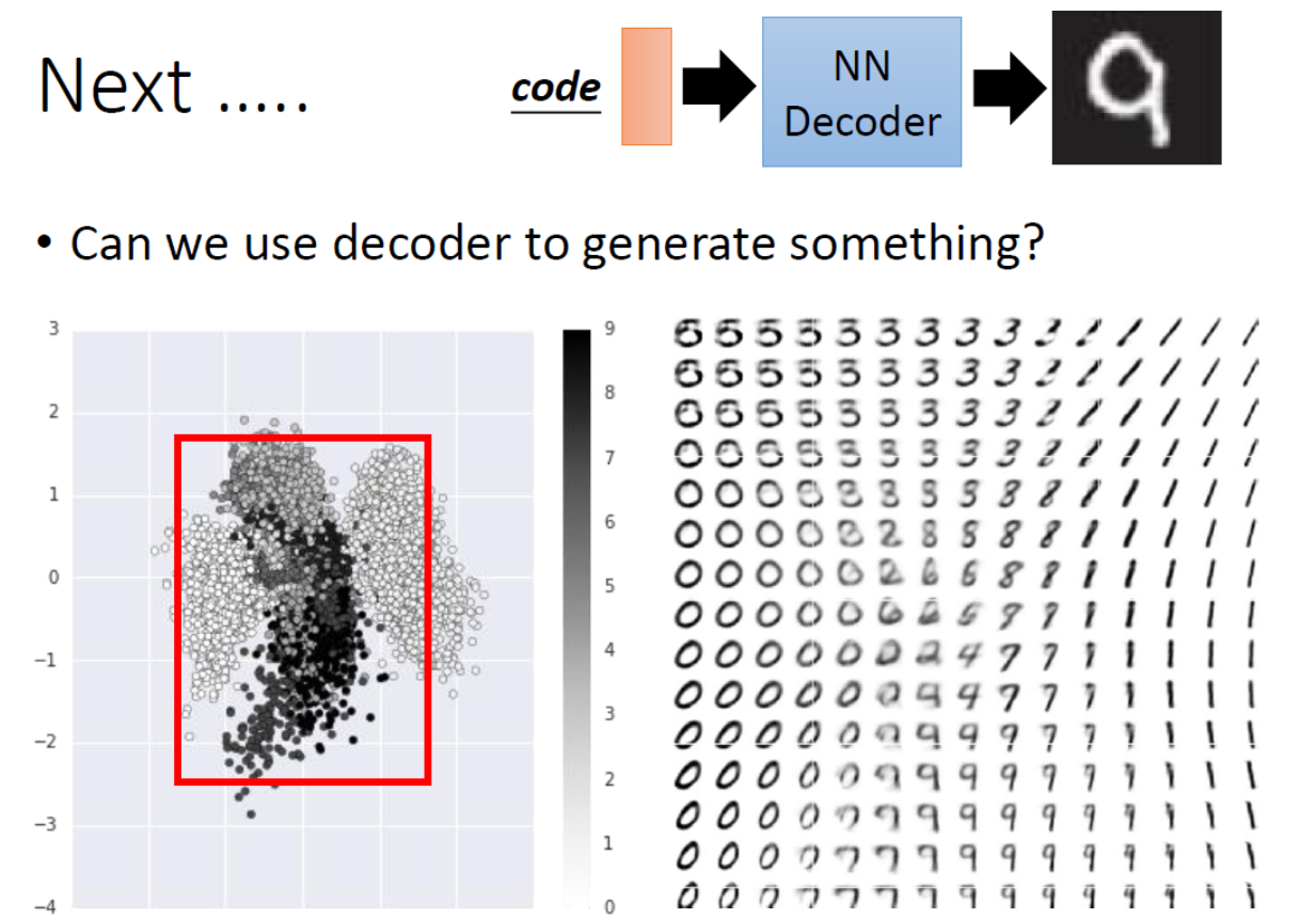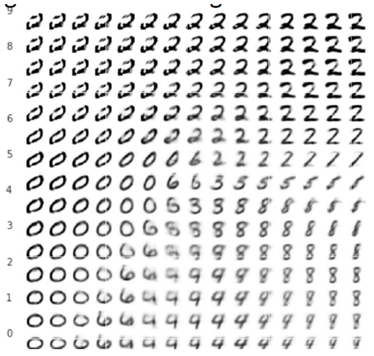 假如有一张图,中间2维的隐藏层sample出来是这样的,然后等间隔地去sample vector出来,通过decoder看看会产生什么。