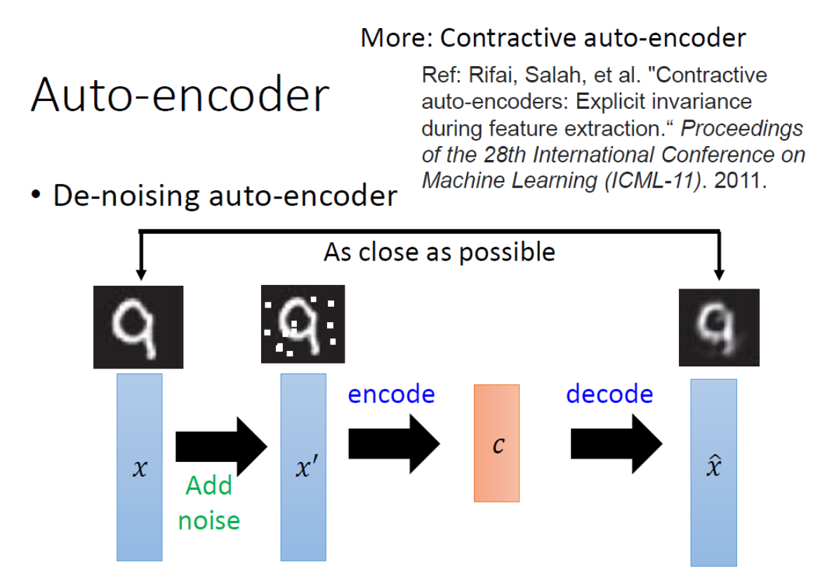 去噪自编码器会给input添加一些噪声,最后的结果和添加噪声前的做比对。这样除了能学到特征,还能把噪声去掉。