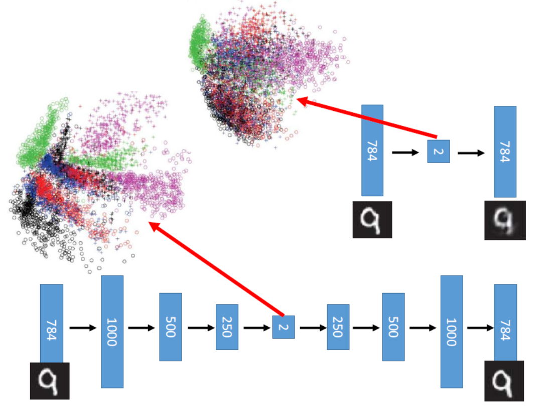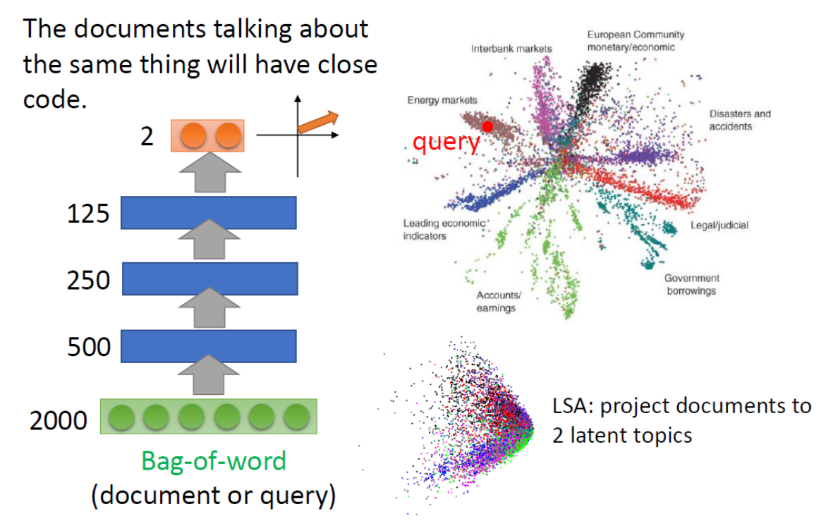 用自编码器的话,同类的文章会成为一簇,查询的时候可以得到同类的结果,即使这个文章和查询没有词汇关联。但用LSA的话就得不到这样的结果。