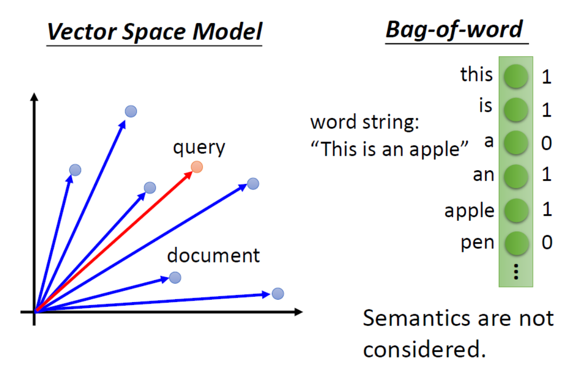 对于文本检索来说,就是求query和document向量之间的内积,得到最相近的结果。而表示文章的方法就是用词袋模型,不过词袋模型不会考虑语义信息。