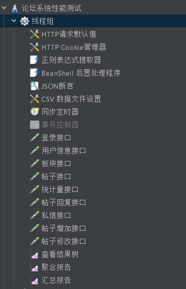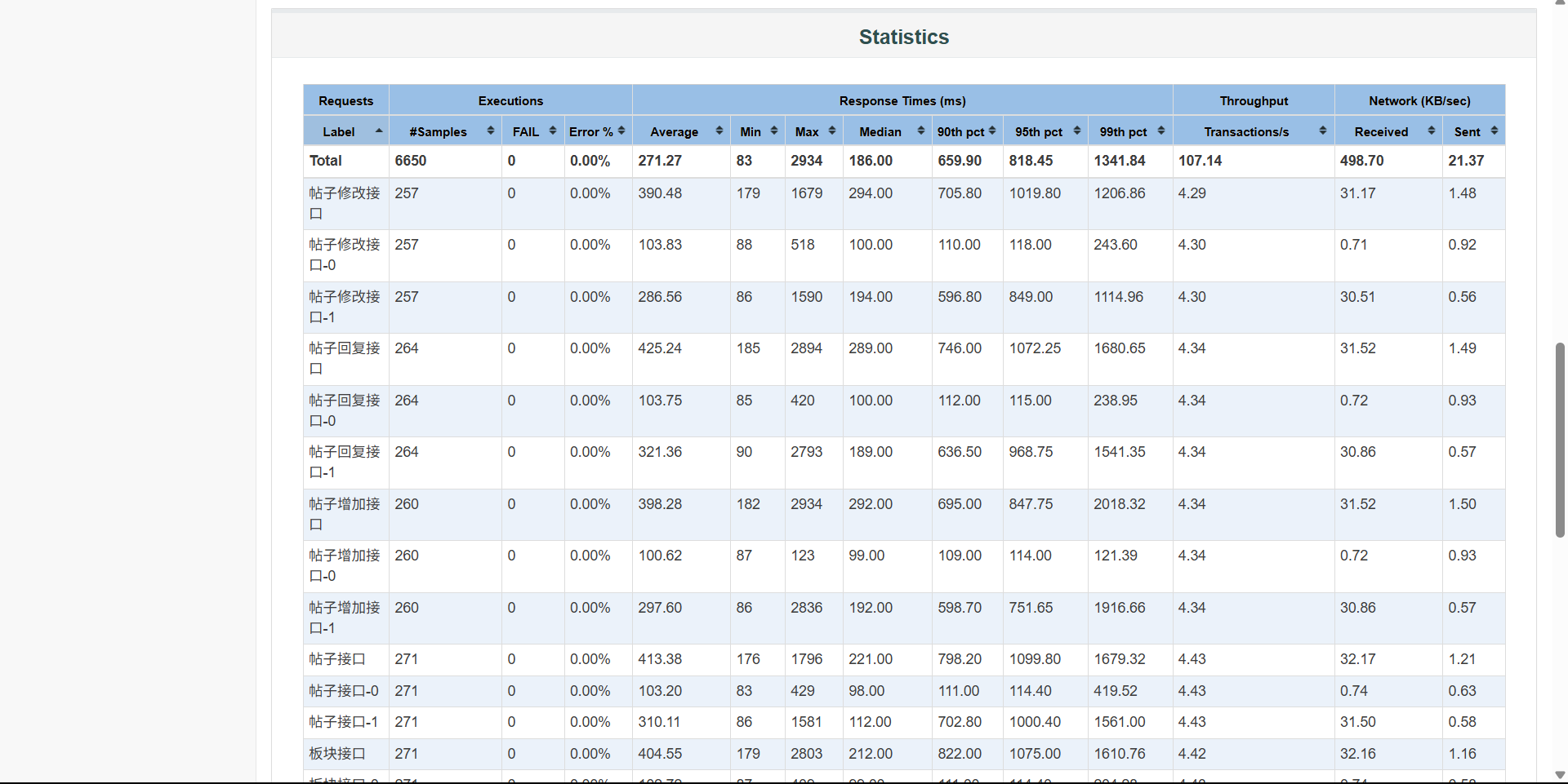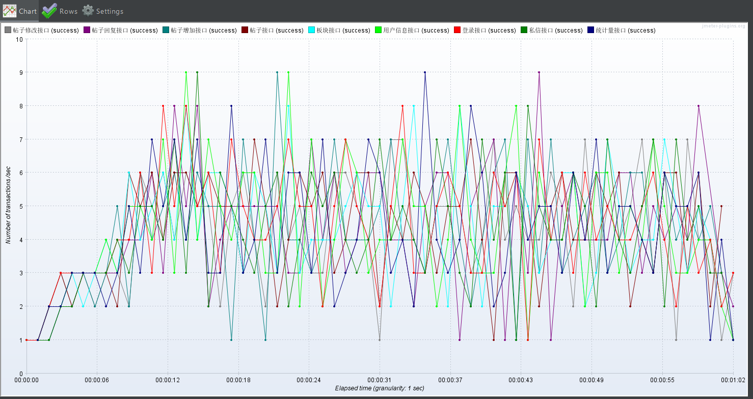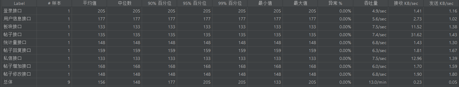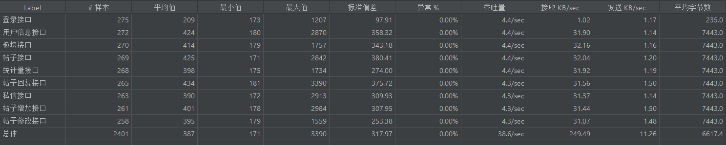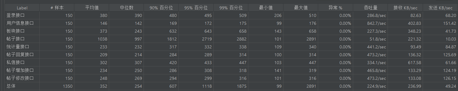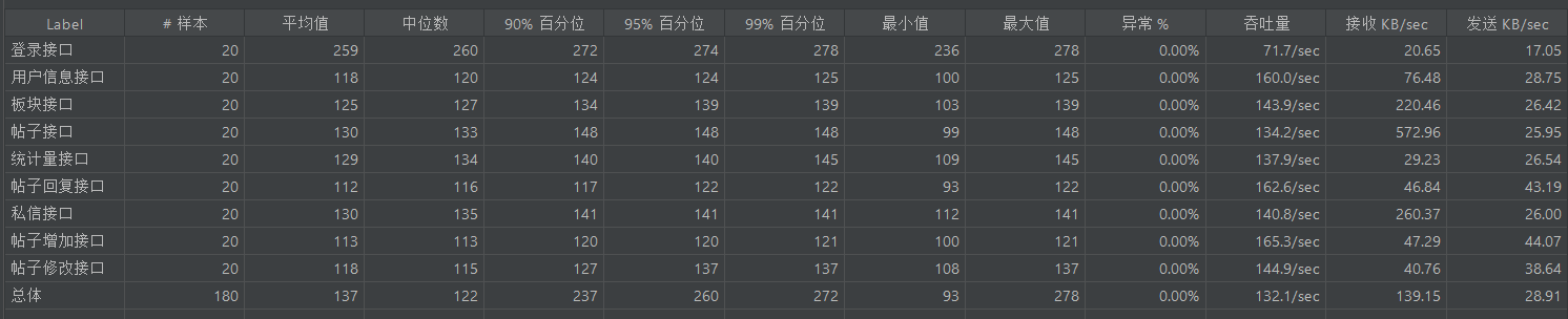 基准测试主要覆盖登录、贴子列表获取、帖子详情、回复列表、帖子回复、私信列表、板块列表、用户信息、帖子添加、帖子修改、私信回复等接口进行基准测试,测试时长持续20s,如果普通的基准测试都无法达到指标无需再进行负载和稳定性测试。