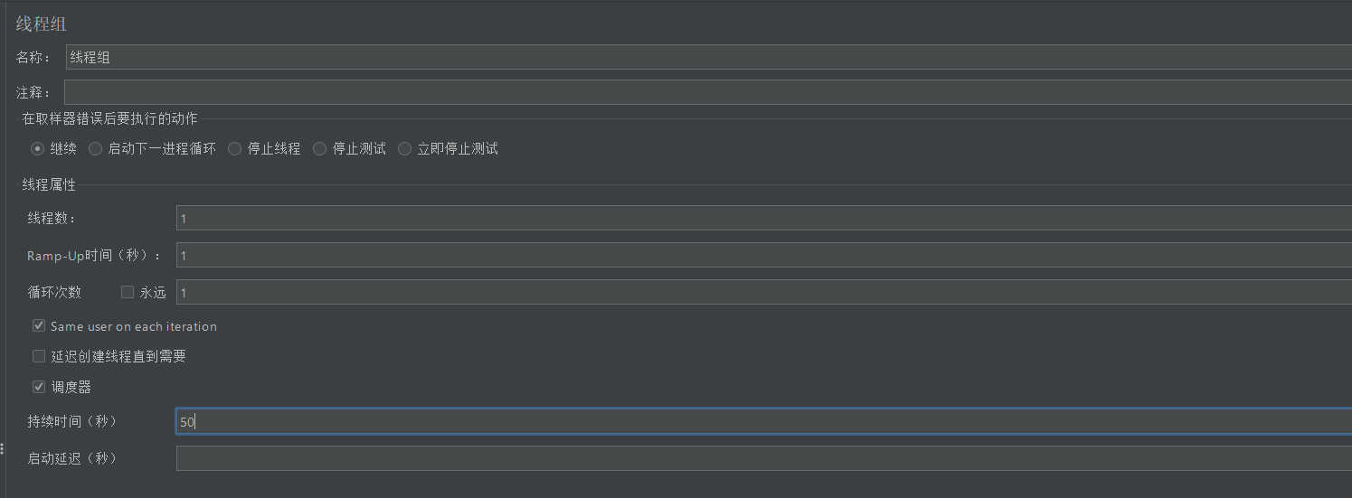 线程数设置1,持续时间50s。
