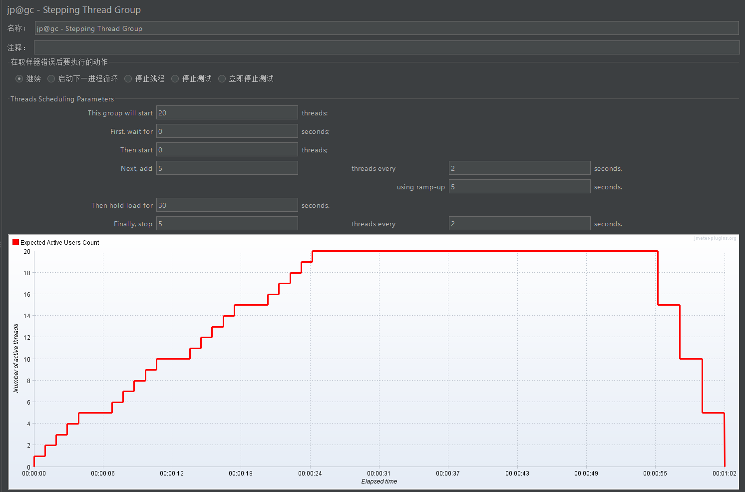 设置最多进行20个线程,同线程组里的线程;等待0秒后开始执行性能测试,一开始有0个线程,下一次增加5个线程;线程全部启动后持续运行30s,2s释放5个线程。