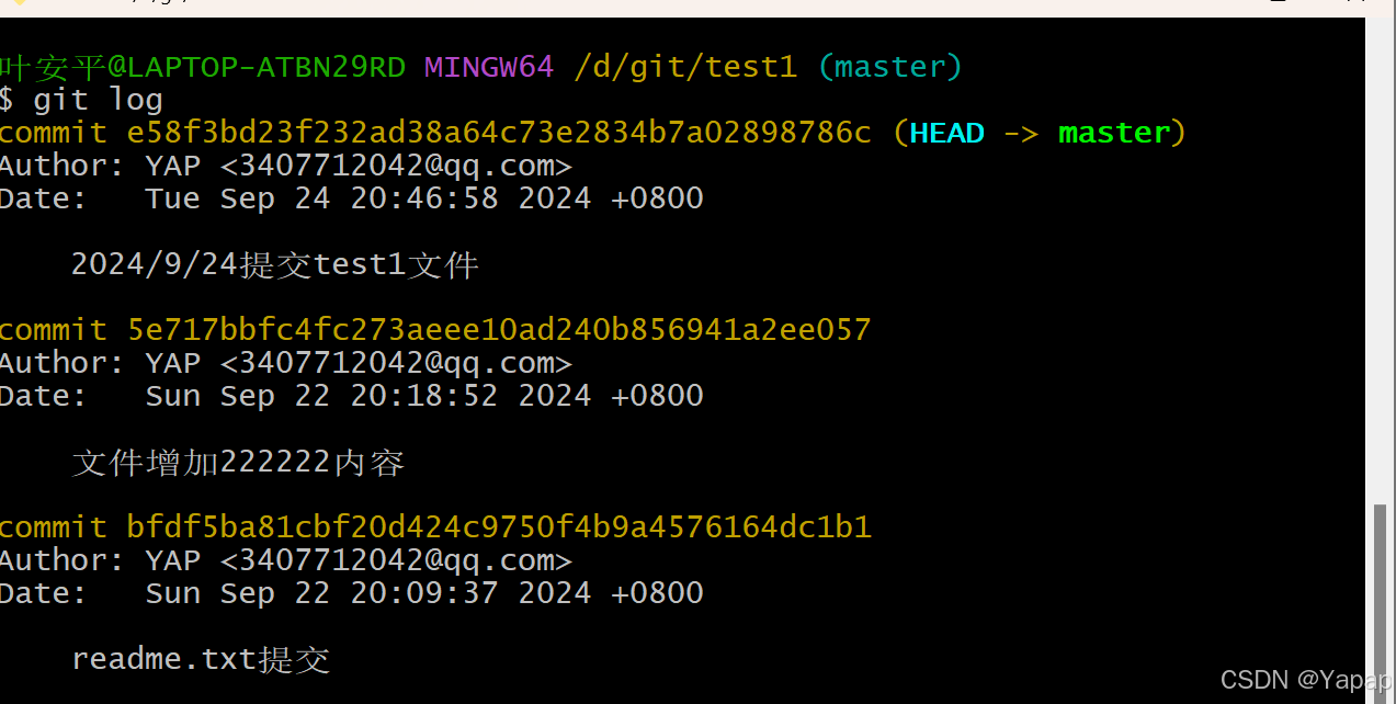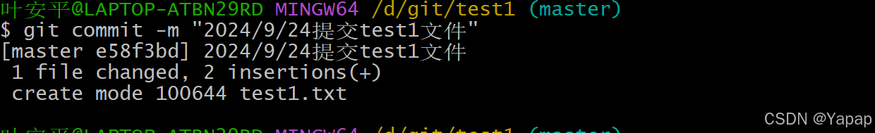 接下来还需要二次提交到本地仓库使用 git commit -m "2024/9/24提交test1文件"