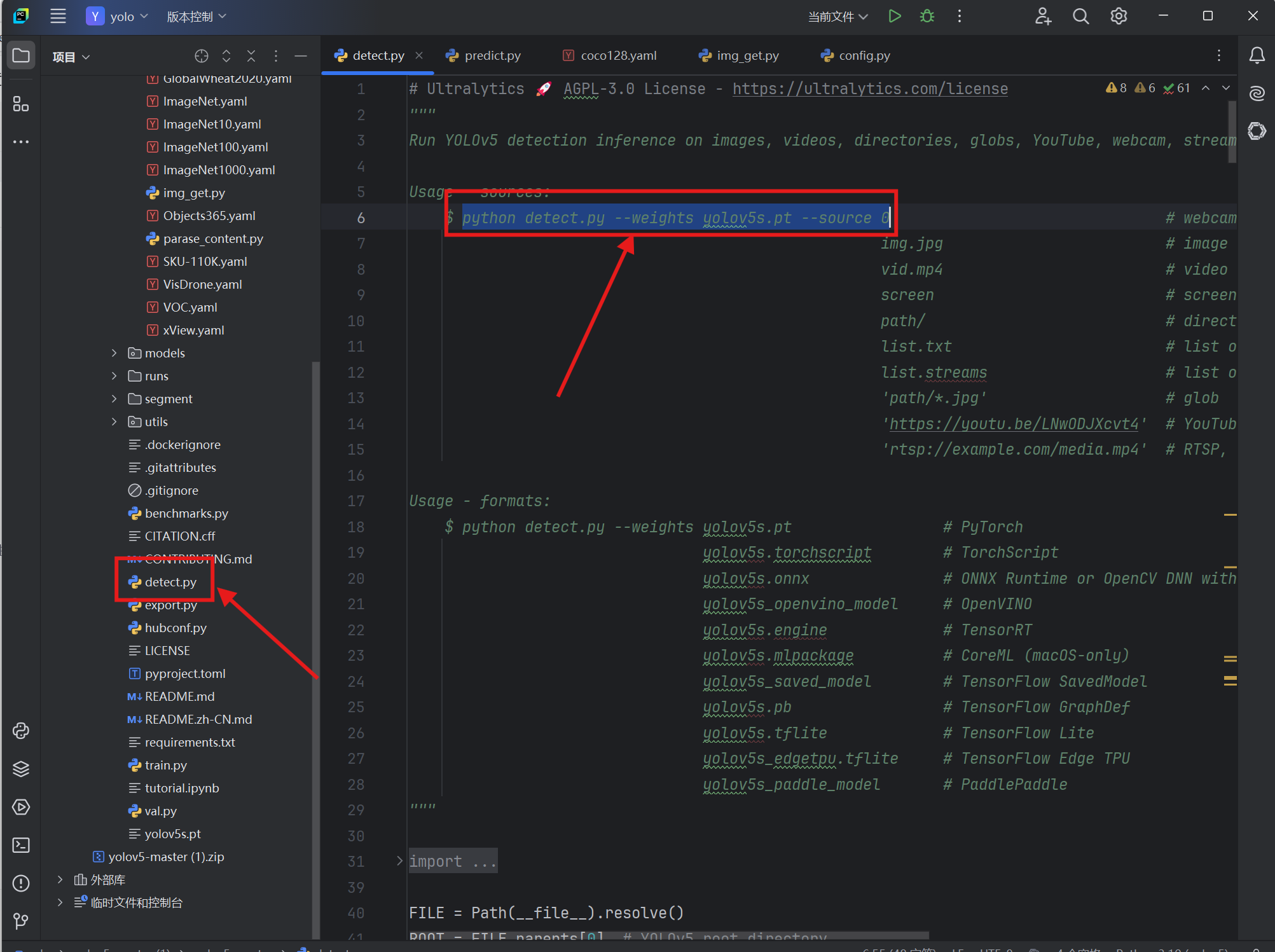 打开文件夹目录中的detect.py 并复制方框中代码
