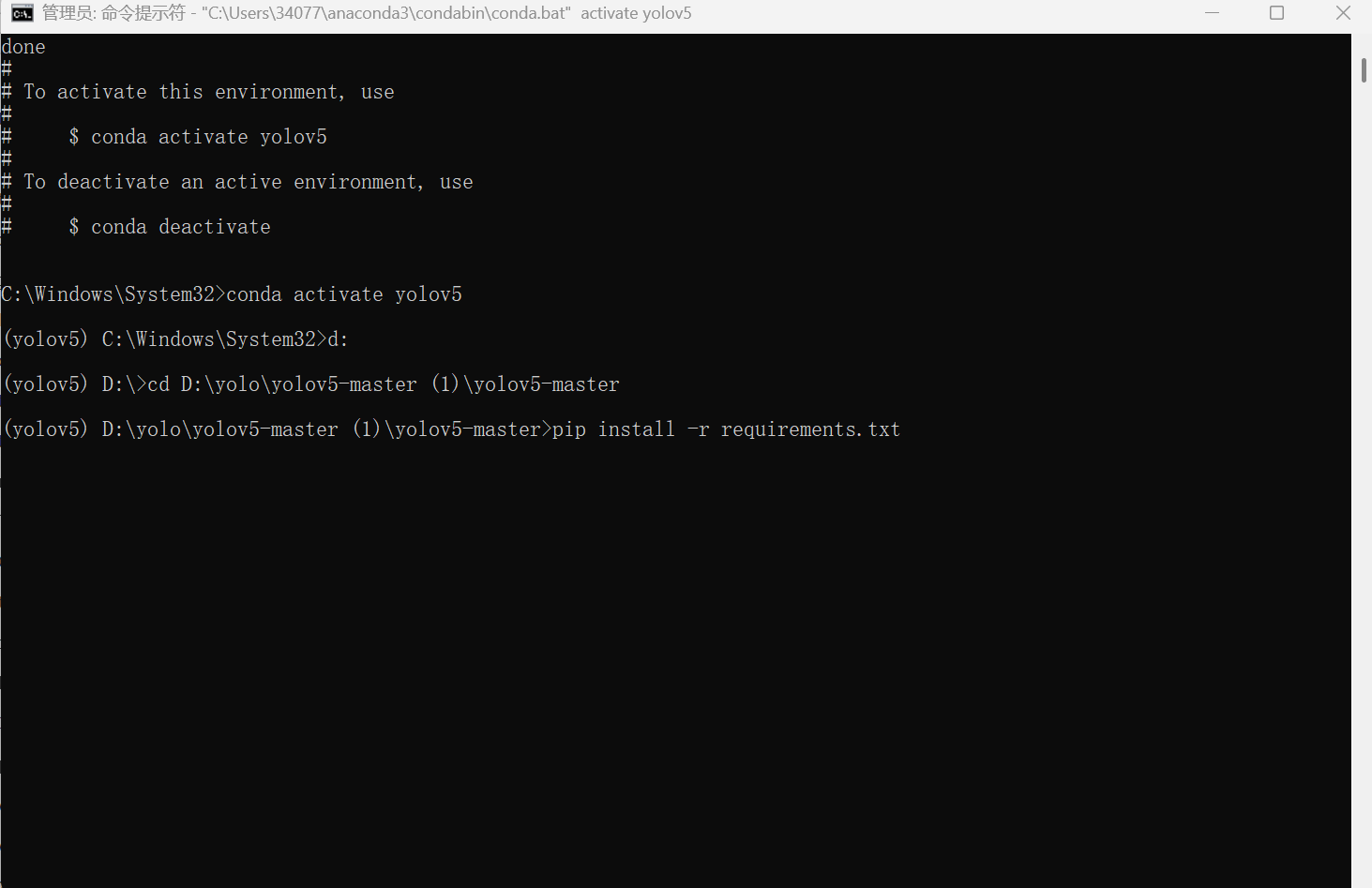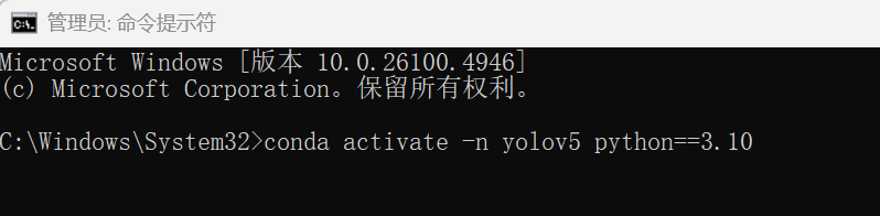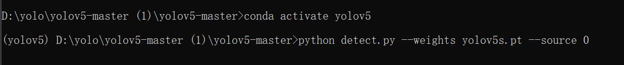 在得到结果后输入 conda activate yolov5 对环境进行激活,显示如下