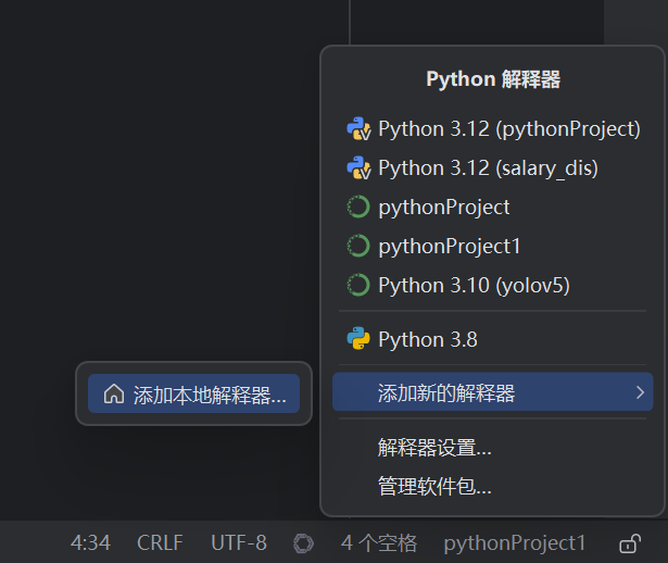 在pycharm右下角点击添加本地解释器
