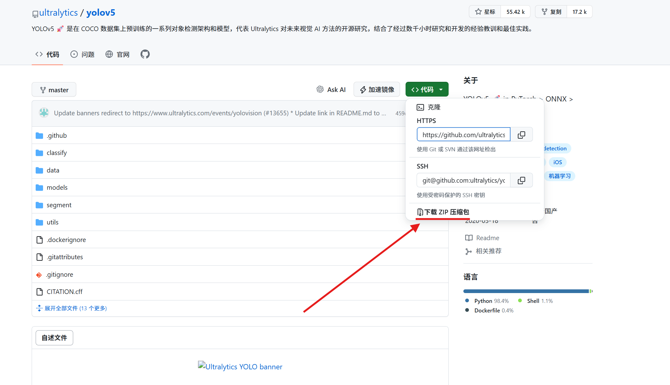目前GitHub上有非常多的yolov5代码,搜索一个正确的网址进行压缩包的安装