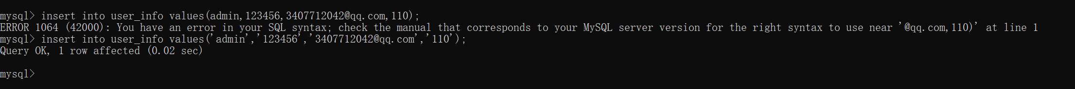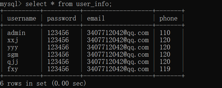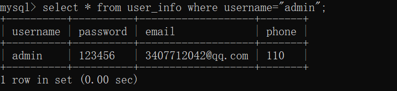 当数据过多需要进行检索时 输入select * from user_info where username="admin"; (引号中的内容即为我们查找的内容)