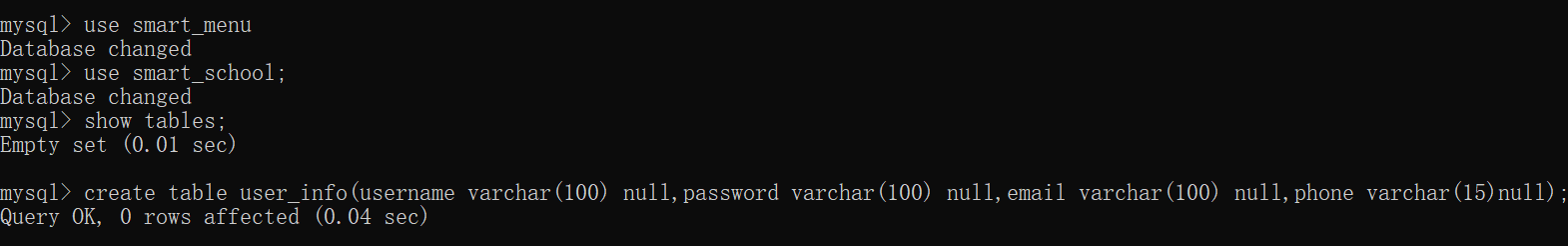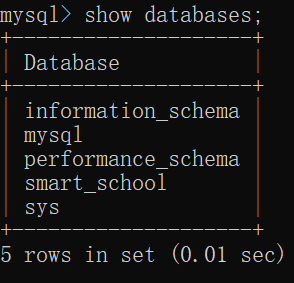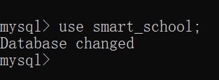 若想要使用我们创建的数据库, 输入 use smart_school; (显示 Database changed 则表示已切换成功)