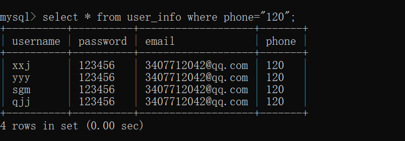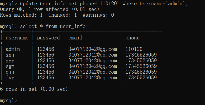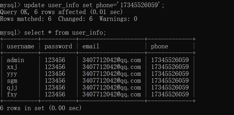 修改表中的数据时 输入 update user_info set phone=' 17345526059' ; (引号内容同理)