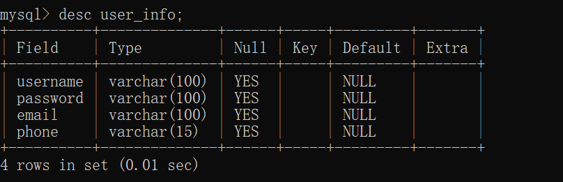 当我们完成以上步骤想要查看数据时输入 desc user_info;