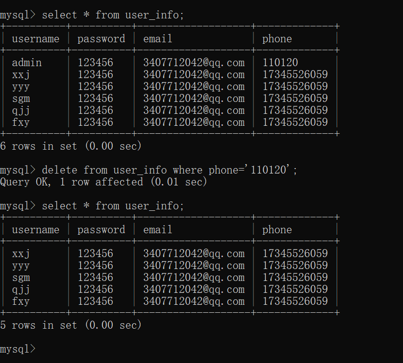 删除书需要用到的代码为 delete from user_info where phone=' 110120';