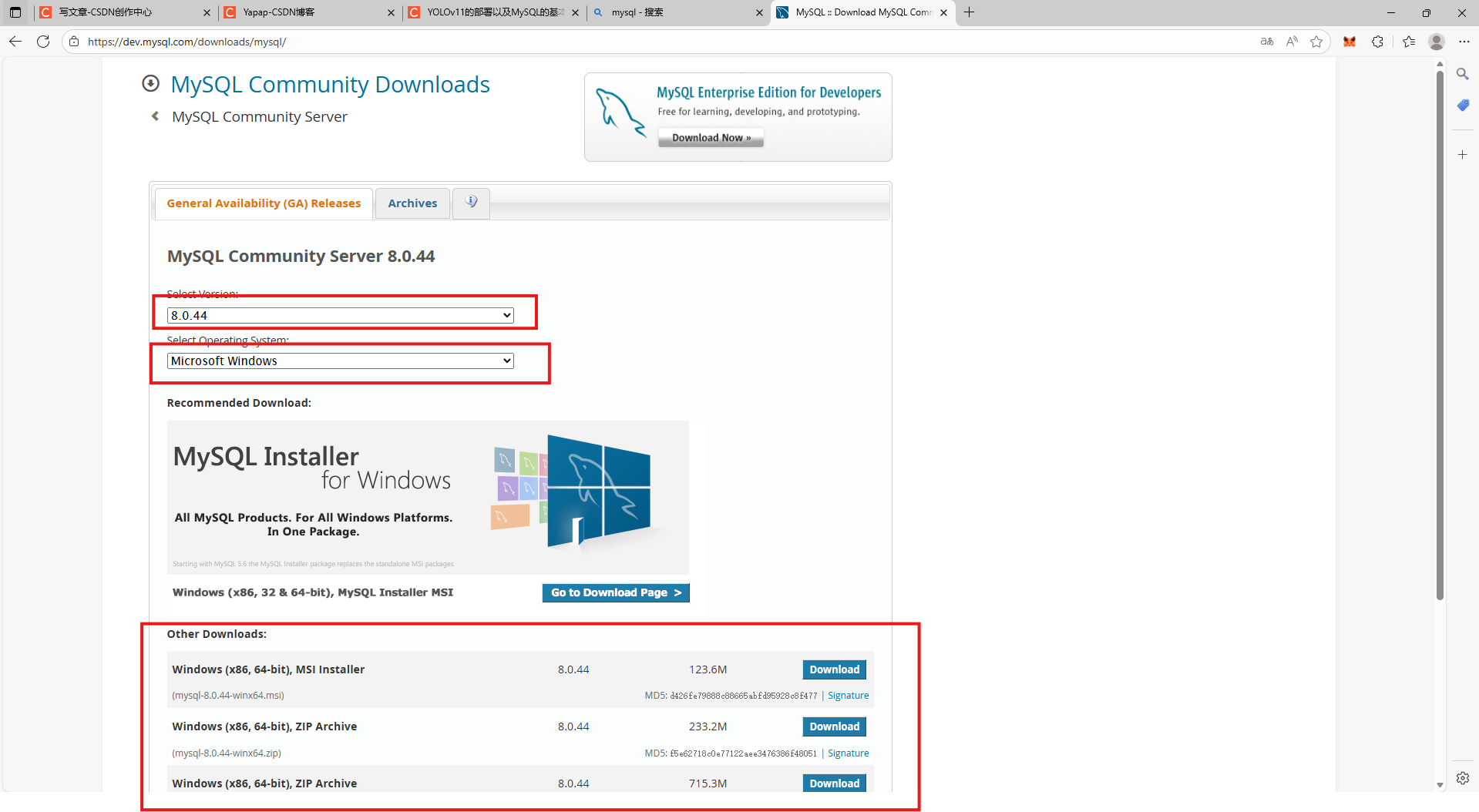 首先在MySQL官网中下载MySQL数据库,在此页面中选择要下载的版本及系统位置