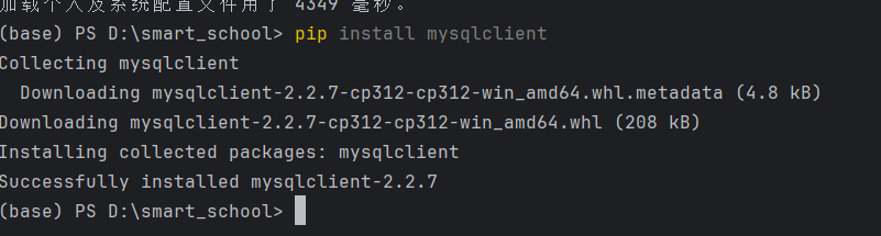 完成此步骤后,在pycharm的终端中运行 pip install mysqlclient (因为我已经安装过了,可能显示会有所不同)